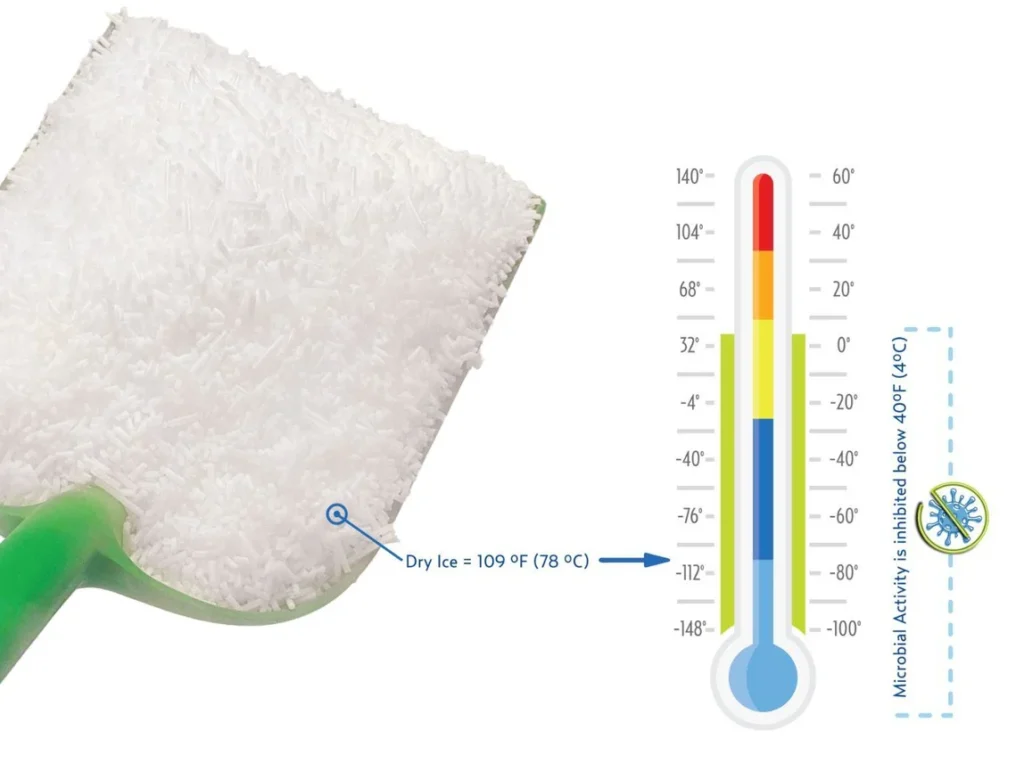 Đá khô duy trì nhiệt độ -78,5°C (-109,3°F), lạnh hơn nhiều so với đá nước. Độ lạnh cực độ này hoàn hảo để đông lạnh nhanh các sản phẩm thực phẩm, đảm bảo chúng giữ được kết cấu, hương vị và giá trị dinh dưỡng. Ngoài ra, đá khô thăng hoa, chuyển trực tiếp từ thể rắn sang thể khí, không để lại cặn lỏng. Điều này đặc biệt có lợi trong môi trường mà độ ẩm có thể làm giảm chất lượng sản phẩm hoặc vệ sinh.